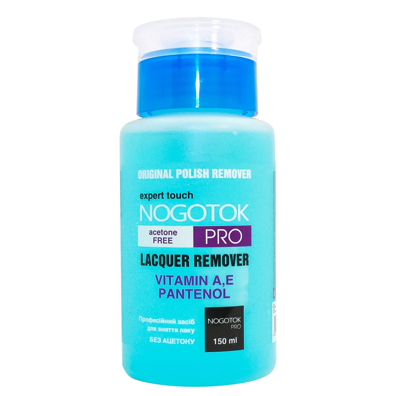 Засіб для зняття лаку Nogotok PRO з вітамінами А, Е і пантенолом без ацетону з помпою Блакитний 150мл
