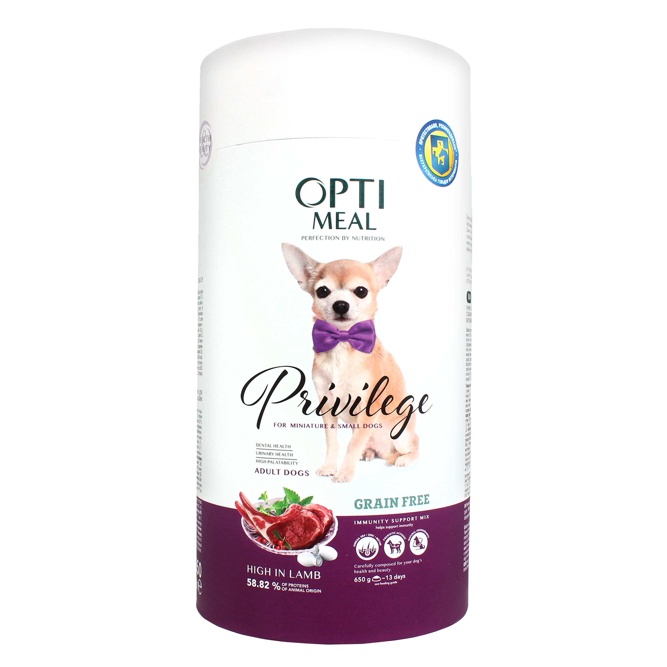 This page displays as much information as possible about Корм сухий для дорослих собак мініатюрних та малих порід з високим вмістом ягнятини Privilege Optimeal тубус 650г.