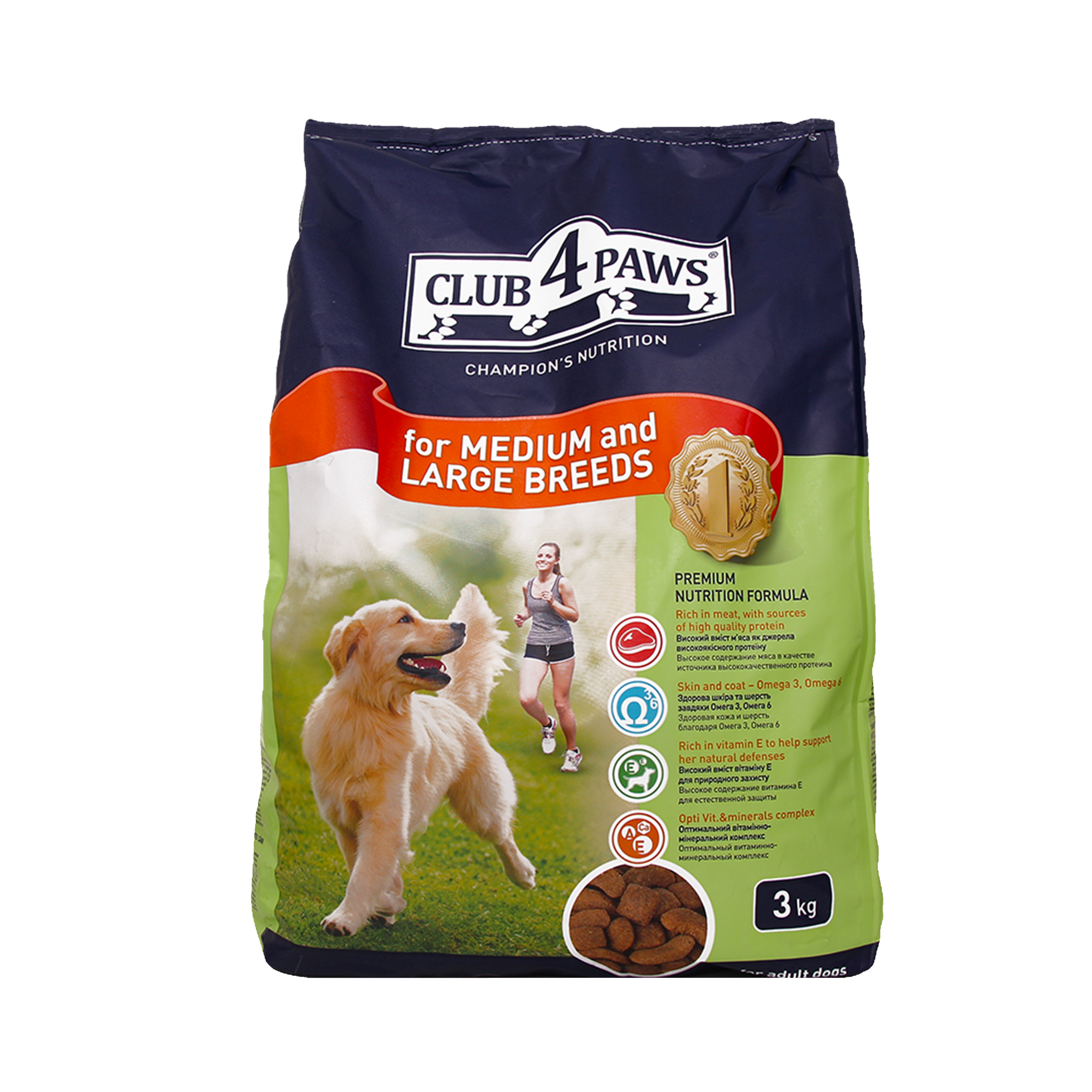This page displays as much information as possible about Корм сухий для дорослих собак середніх та великих порід Club 4 Paws м/у 3кг.